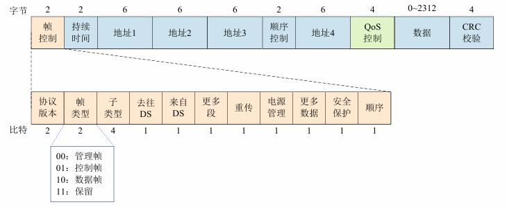 - 帧控制:具有多种用途(关联请求、响应,探测请求、响应,解除关联,信标帧,认证,解除认证等)