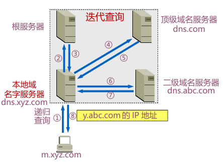 * 递归解析器/本地域名字服务器向根服务器可以采用递归查询,但一般优先采用迭代查询