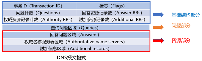 * 分为三部分:基础结构(报文首部)、问题、资源记录(RR,ResourceRecord)